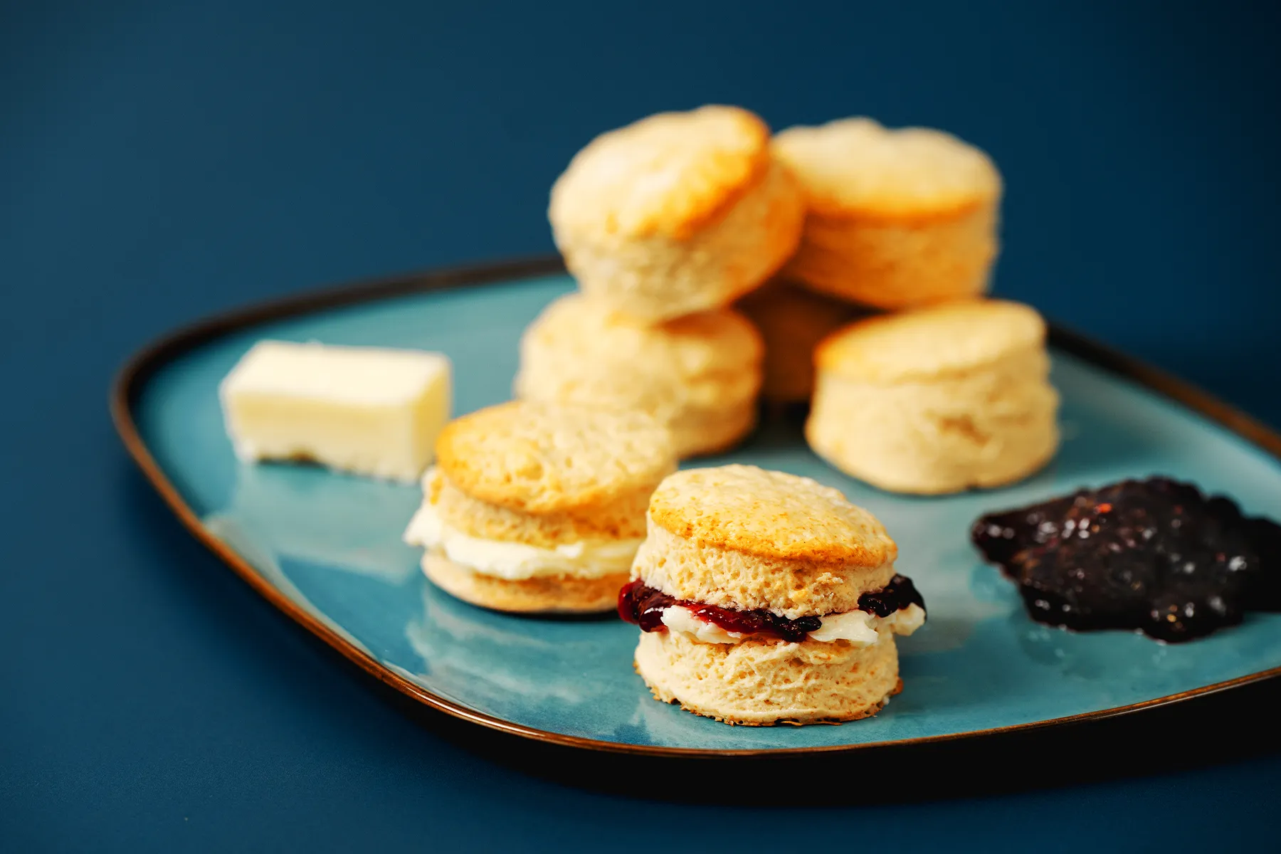 Sirva os scones acompanhados de manteiga, natas azedas e compota de frutos vermelhos.